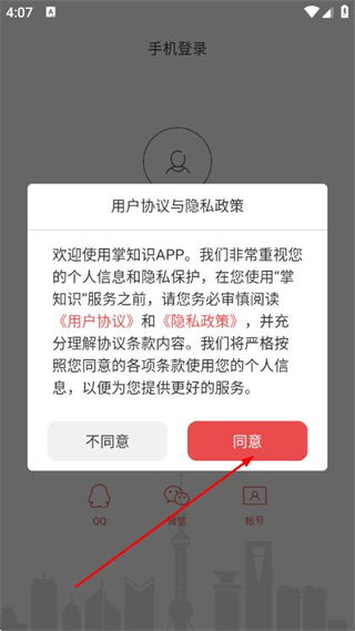 1、打開掌知識(shí)APP,在用戶協(xié)議與隱私政策彈窗中點(diǎn)擊同意。