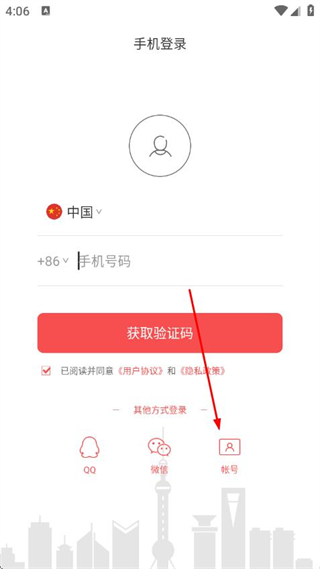 2、在手機(jī)登錄頁面點(diǎn)擊帳號(hào),進(jìn)入帳號(hào)登錄頁面。