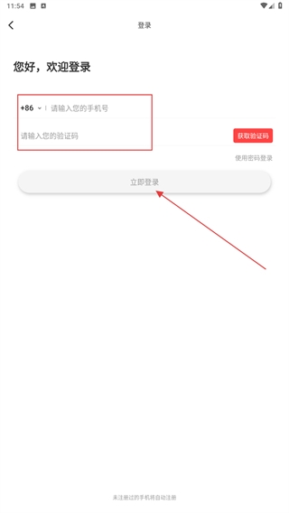 3、輸入手機(jī)號、驗證碼后,點擊立即登錄即可完成。