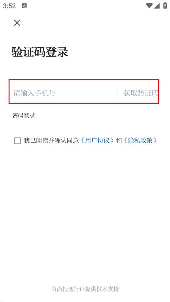 4、進(jìn)入登錄頁面,勾選已閱讀并確認(rèn)同意用戶協(xié)議和隱私政策,輸入手機(jī)號(hào),點(diǎn)擊獲取驗(yàn)證碼,完成登錄。