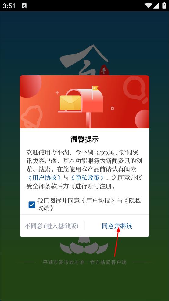 1、打開今平湖,會(huì)彈出溫馨提示框,勾選已閱讀并同意用戶協(xié)議與隱私政策,點(diǎn)擊同意并繼續(xù)。