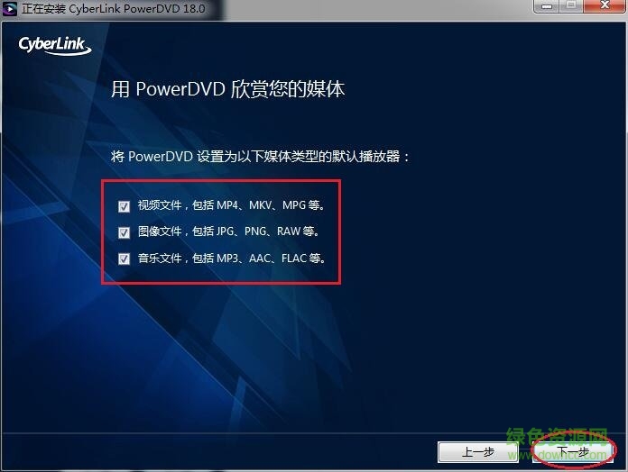3.勾選可播放文件格式,都是要用到的,所有都勾上吧!然后點(diǎn)擊“下一步”