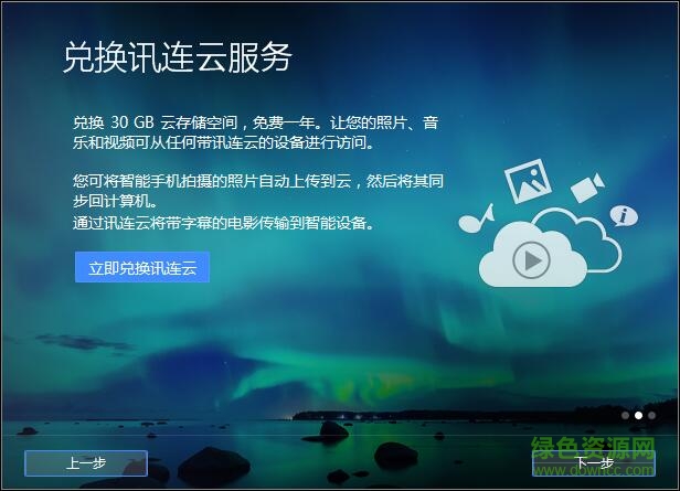 8.啟動(dòng)過(guò)程中,會(huì)有一個(gè)提示兌換訊連云服務(wù)的窗口,建議都免費(fèi)兌換30GB云存儲(chǔ)空間,讓您的照片、音樂(lè)和視頻可從任何帶訊連云的設(shè)備進(jìn)行訪問(wèn)。