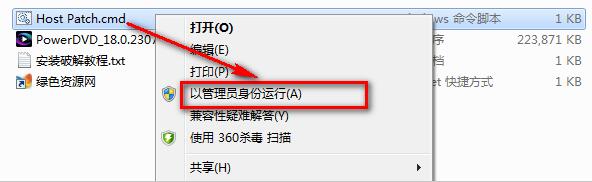 10.如果安裝上面操作完成后,powerdvd 18不是修改的,那么,請(qǐng)“斷網(wǎng)”后,右鍵選擇“以管理員的身份允許”文件夾中的“Host Patch.cmd”,殺軟也會(huì)誤報(bào),選擇運(yùn)行操作