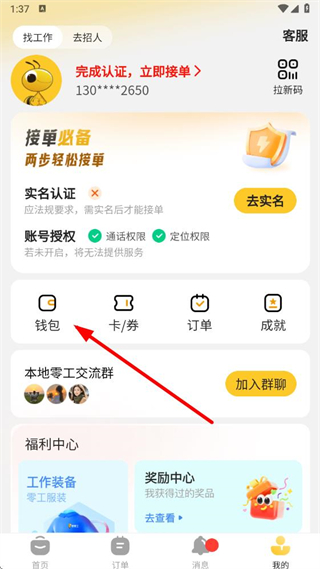 1、在找零工app個(gè)人頁面點(diǎn)擊錢包選項(xiàng),進(jìn)入我的錢包頁面。