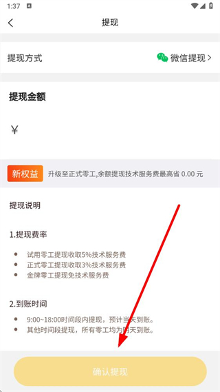 4、在提現(xiàn)頁面輸入提現(xiàn)金額,點(diǎn)擊確認(rèn)提現(xiàn)按鈕,即可完成提現(xiàn)到微信的操作。