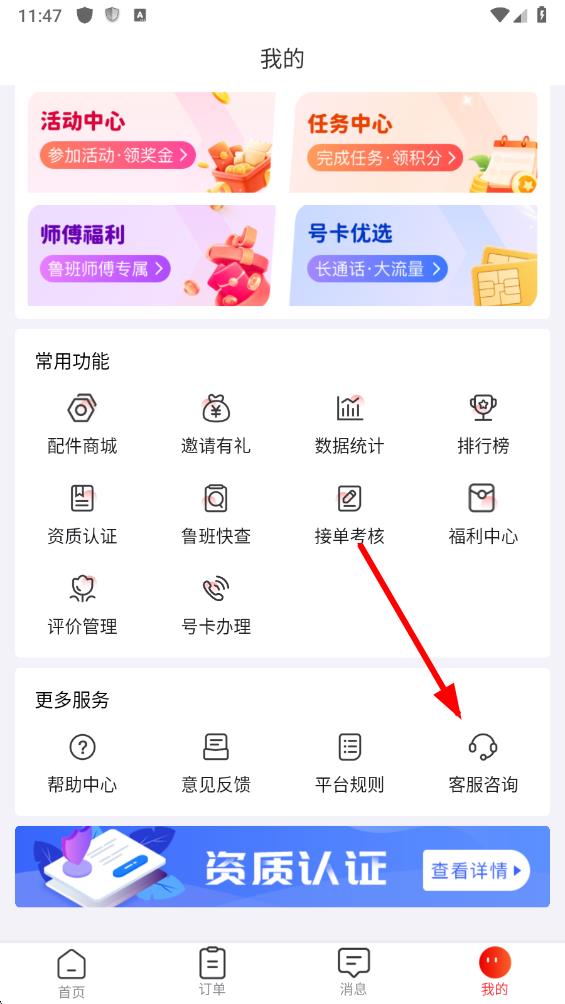 2、在個人界面的更多服務(wù)板塊中,找到并點擊客服咨詢選項。