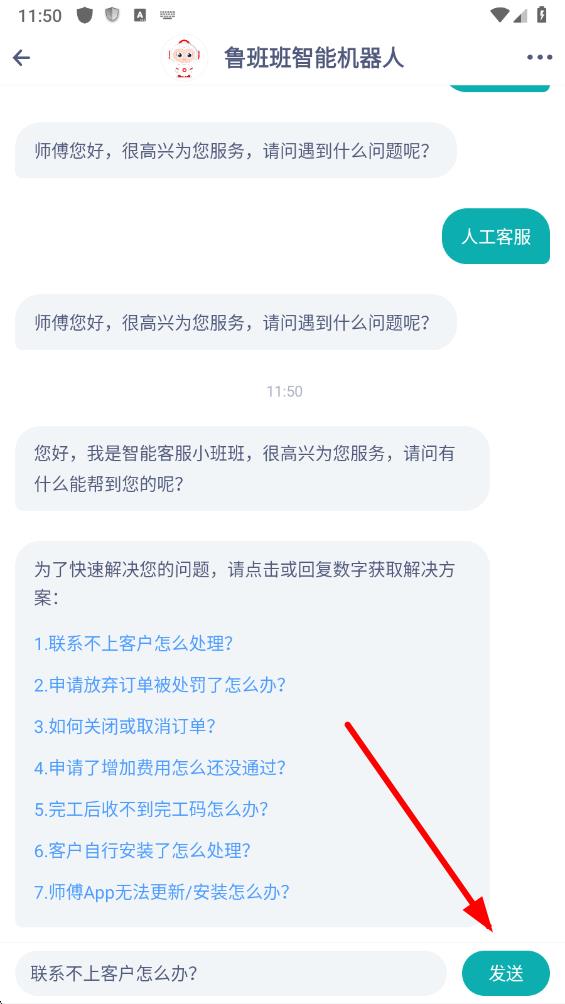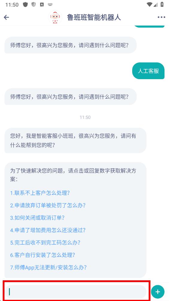 3、進入與魯班班智能機器人對話界面后,在下方輸入框中輸入你遇到的問題。