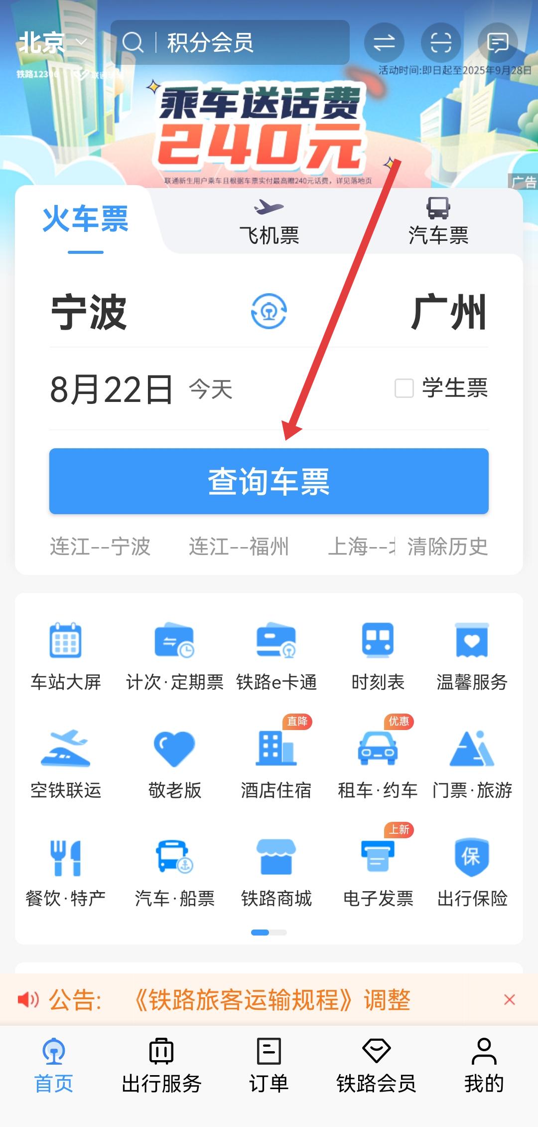 1、打開鐵路12306APP,進(jìn)入首頁后選擇出發(fā)地、目的地及乘車日期,點(diǎn)擊查詢車票按鈕,進(jìn)入車次列表頁面。