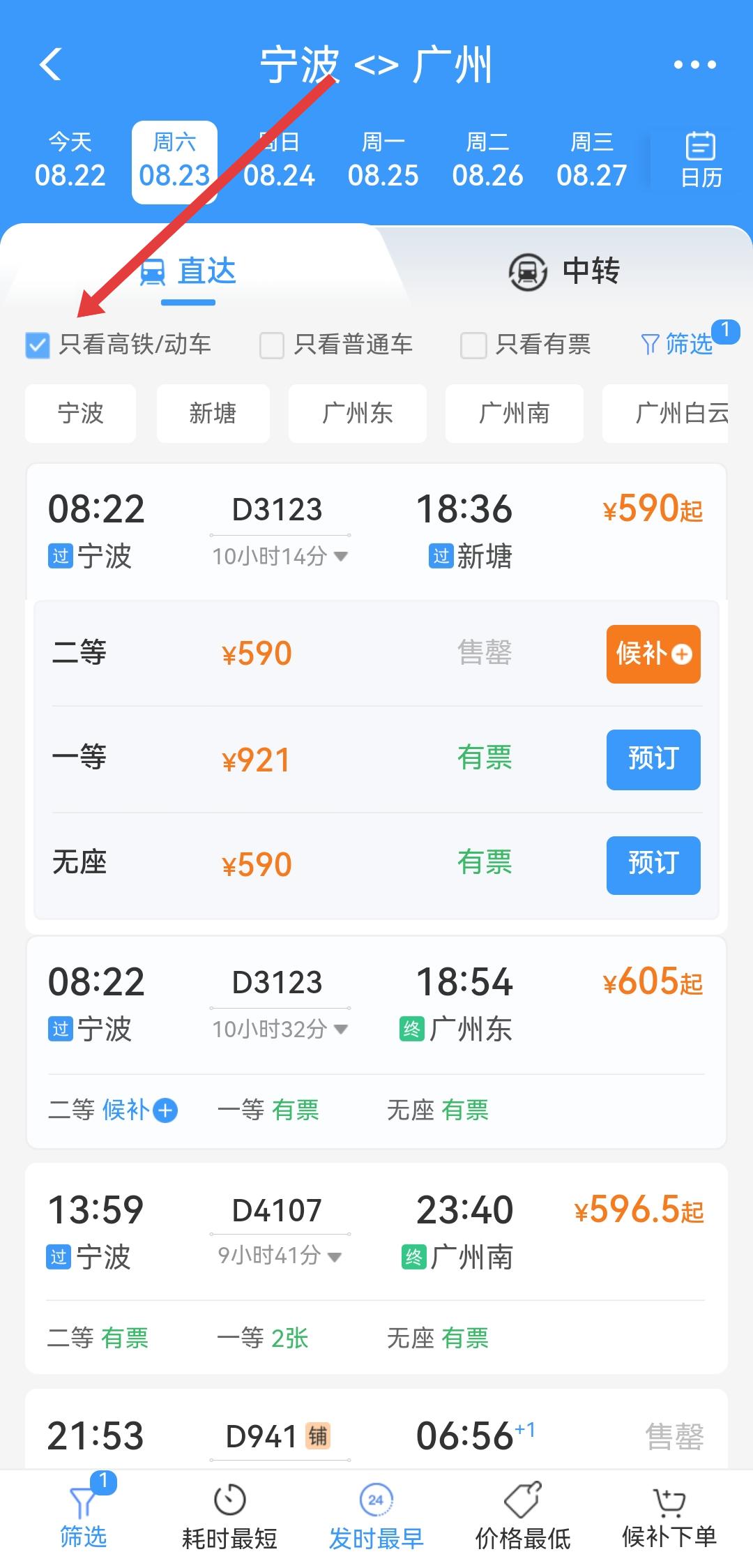2、在車次列表頁面,勾選只看高鐵/動車篩選條件,查看符合要求的高鐵車次,點(diǎn)擊目標(biāo)車次進(jìn)入訂單確認(rèn)頁面。