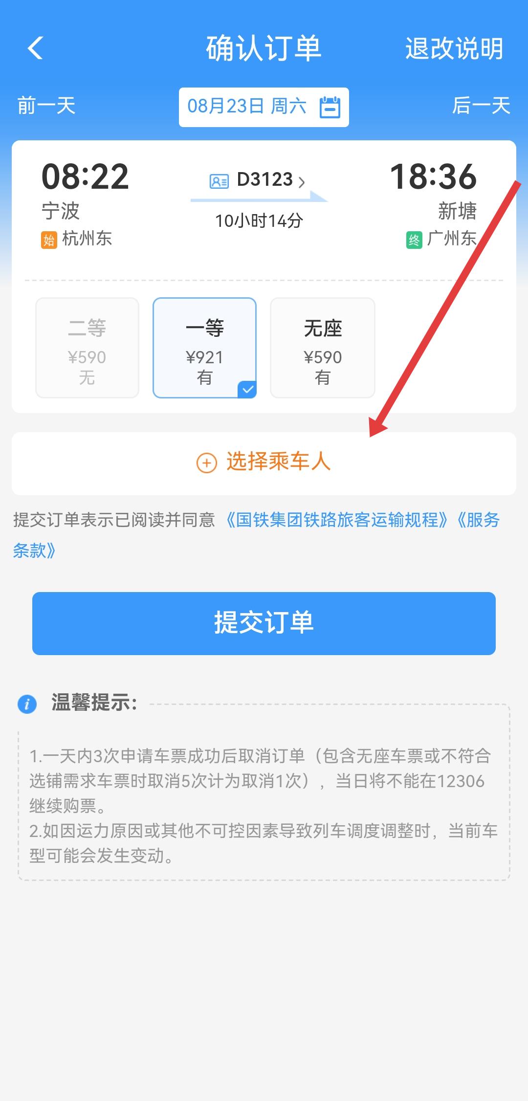 3、在確認(rèn)訂單頁面,選擇座位類型,點(diǎn)擊選擇乘車人按鈕,勾選乘車人信息后返回訂單頁,確認(rèn)信息無誤后點(diǎn)擊提交訂單。