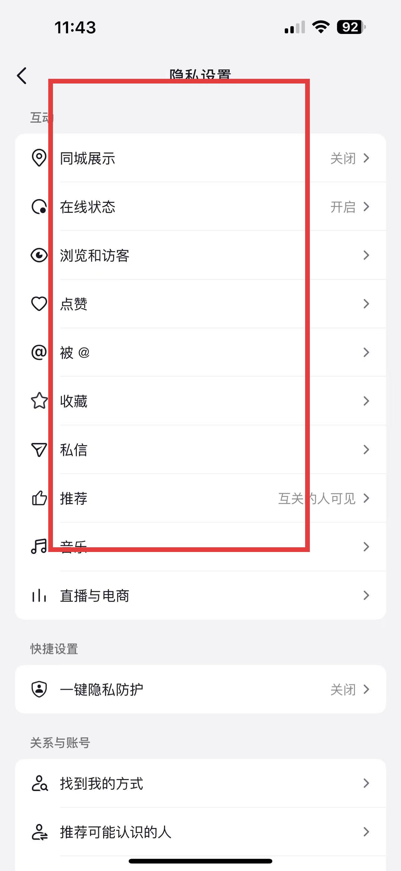 3、在隱私設(shè)置界面,可對(duì)同城展示、在線狀態(tài)、瀏覽和訪客等互動(dòng)類隱私選項(xiàng),按需進(jìn)行開啟或關(guān)閉等權(quán)限設(shè)置。