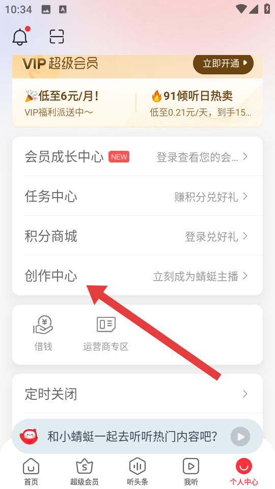 1、在蜻蜓FM個人中心頁面,點擊創(chuàng)作中心,這是進(jìn)入主播相關(guān)功能的關(guān)鍵入口,需準(zhǔn)確點擊。