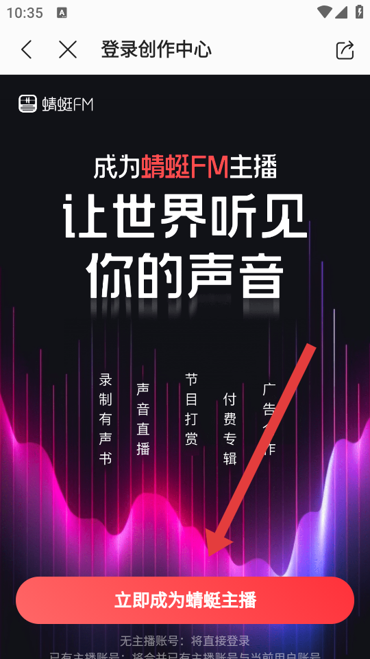 2、進(jìn)入登錄創(chuàng)作中心的頁面后,點擊立即成為蜻蜓主播,完成主播身份的開啟步驟。