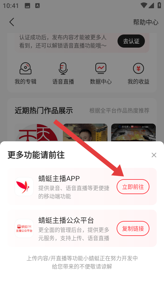 3、當(dāng)看到更多功能請前往的提示時,點擊立即前往蜻蜓主播APP,接單配音等便捷移動端功能可在該APP中使用。