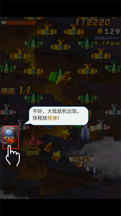 5、當(dāng)出現(xiàn)大批量的飛機時,玩家需要點擊屏幕左側(cè)的核彈按鈕,以快速的轟擊死所有的對手。