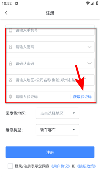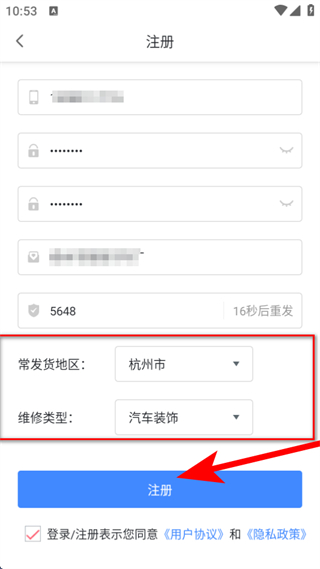 3、選擇常發(fā)貨地區(qū)和維修類型后,點擊注冊,即可完成賬號注冊。