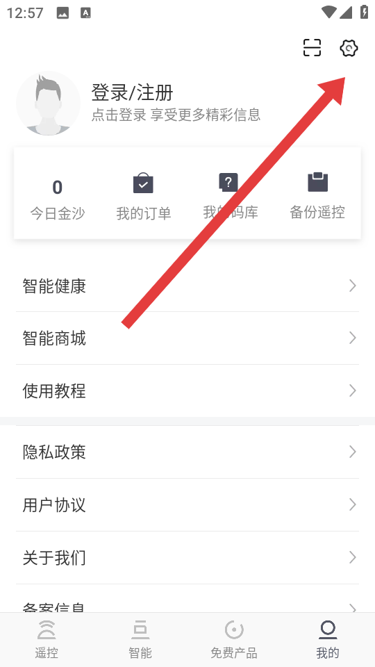 1、打開遙控精靈APP,進入我的頁面后需要點擊右上角設(shè)置圖標(biāo),進入設(shè)置的界面。