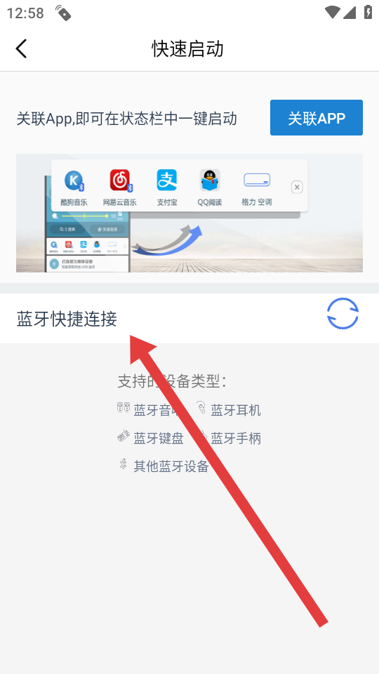 3、在快速啟動頁面,可配置狀態(tài)欄快捷遙控的關(guān)聯(lián)App、藍牙快捷連接等功能,完成狀態(tài)欄快捷鍵設(shè)置。