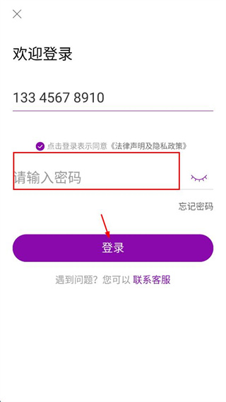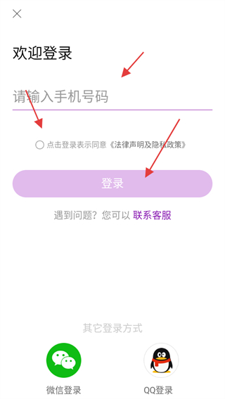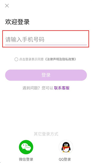3、進入登錄頁面,輸入手機號碼,勾選法律聲明及隱私政策,點擊登錄。