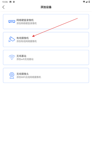 2、進(jìn)入添加設(shè)備的界面內(nèi),選擇并點(diǎn)擊有線攝像機(jī)的按鈕。
