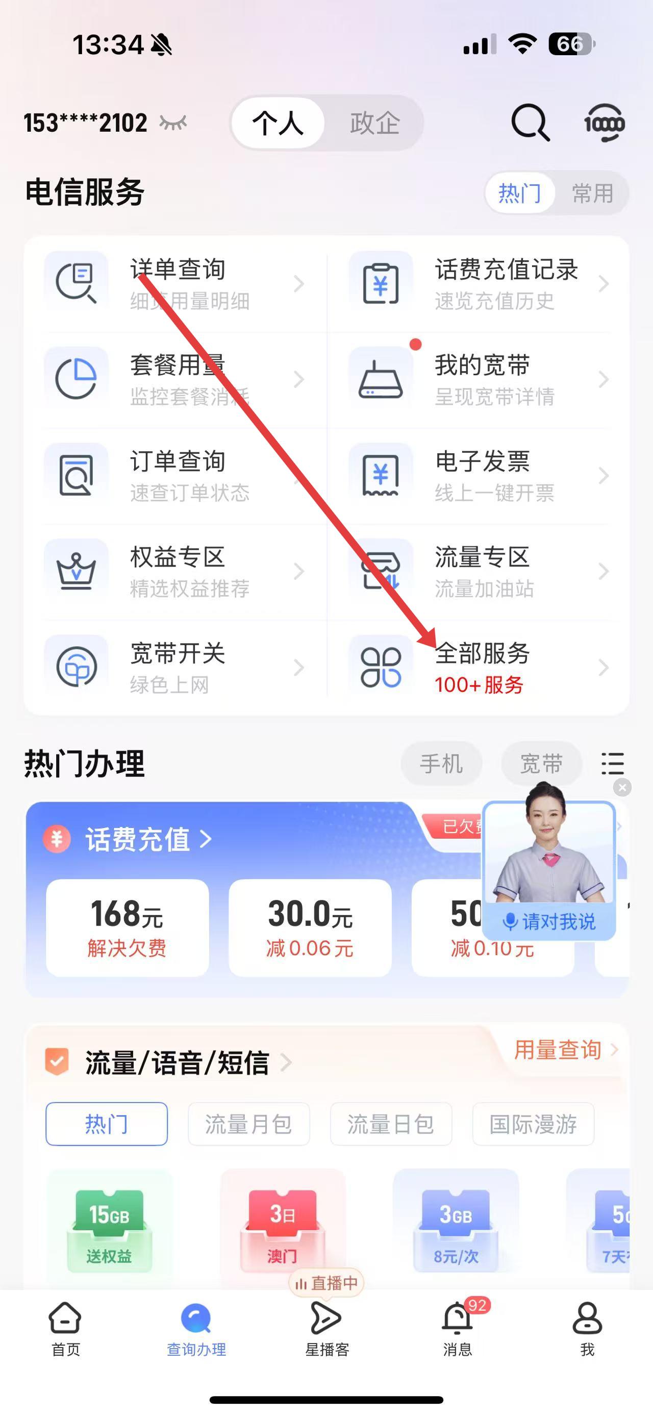 2、在查詢辦理頁面的電信服務板塊,點擊全部服務,查看更多服務選項。