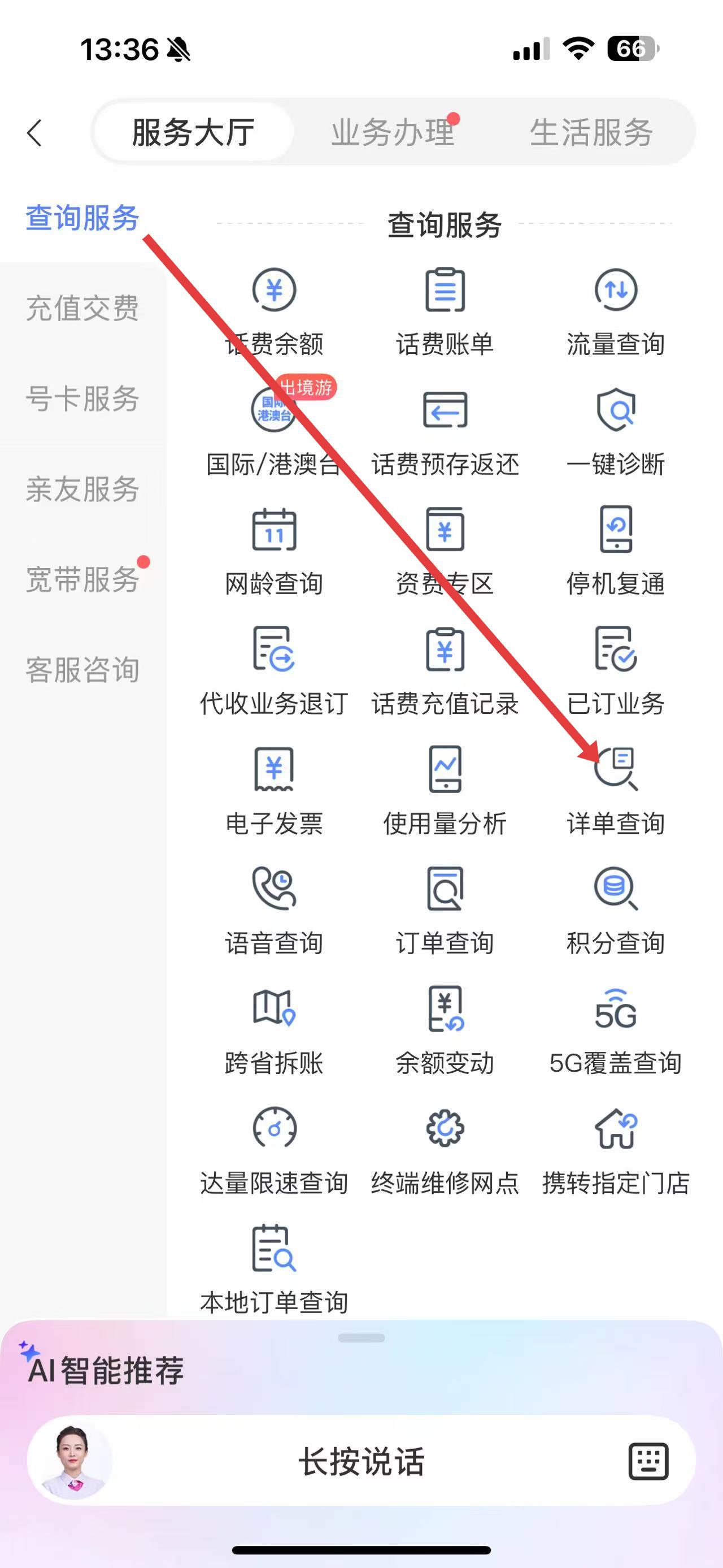 3、進入服務大廳,在查詢服務分類里,找到并點擊詳單查詢,可查詢通話等詳單。