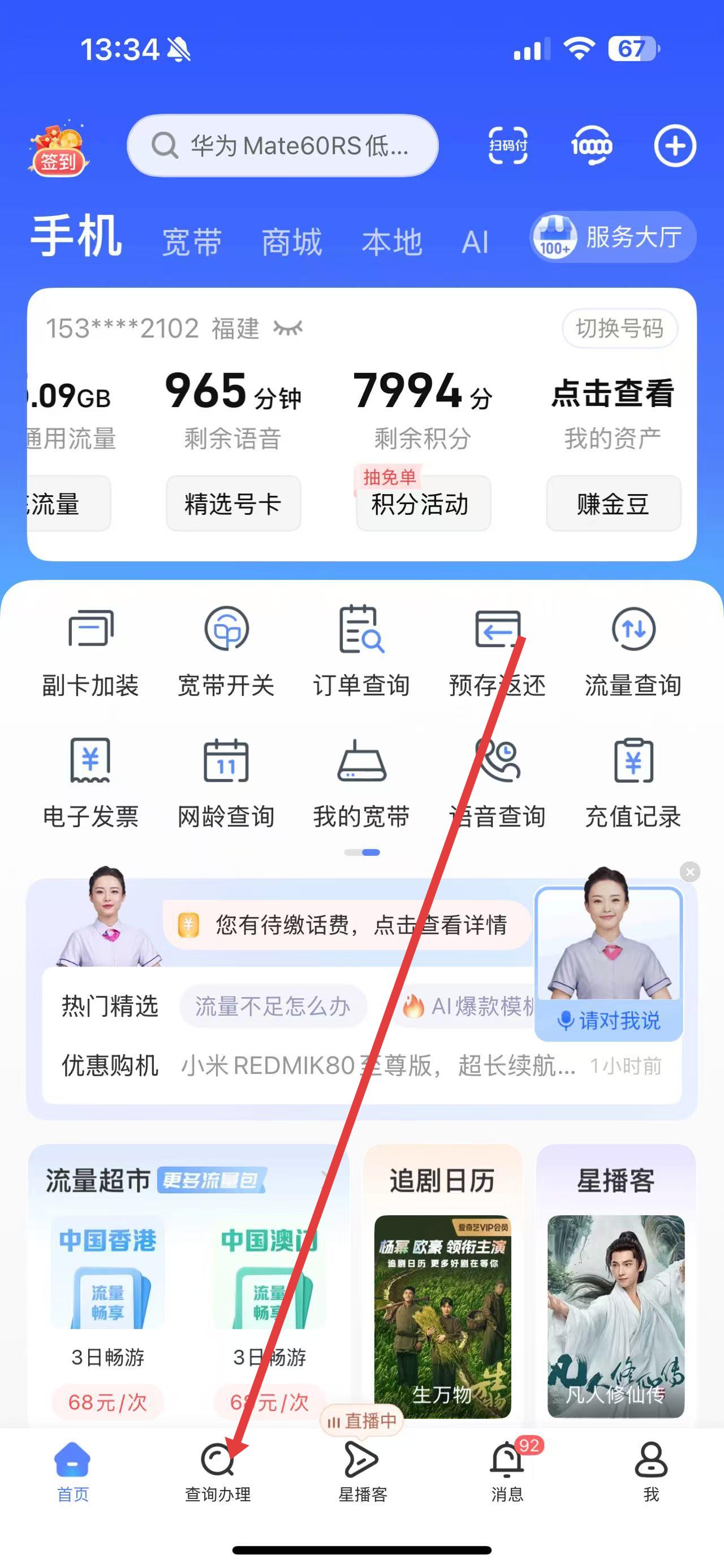 1、打開中國電信APP,點擊底部查詢辦理,進入查詢辦理頁面,開啟業(yè)務查詢流程。