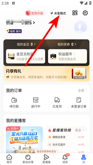 2、在個人的頁面中,找到并點擊關愛模式的選項。