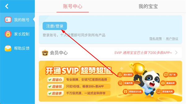 2、在賬號(hào)中心頁(yè)面,找到并點(diǎn)擊注冊(cè)/登錄按鈕。
