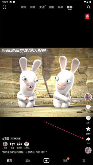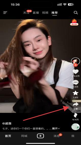 1、在抖音視頻播放的頁面,點擊右側(cè)的分享的箭頭。