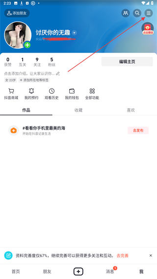 2、進入個人主頁內(nèi),點擊右上角三個橫線的功能圖標(biāo)。