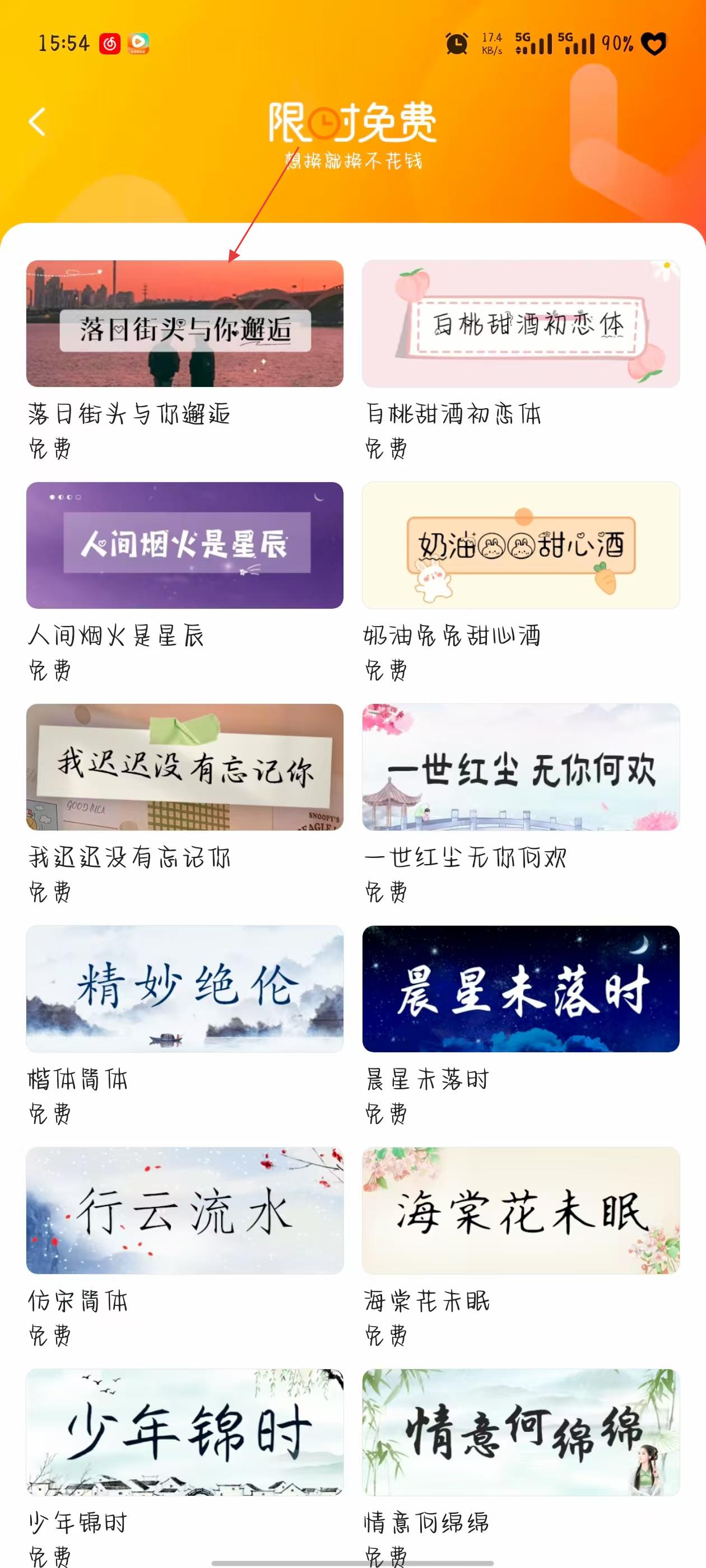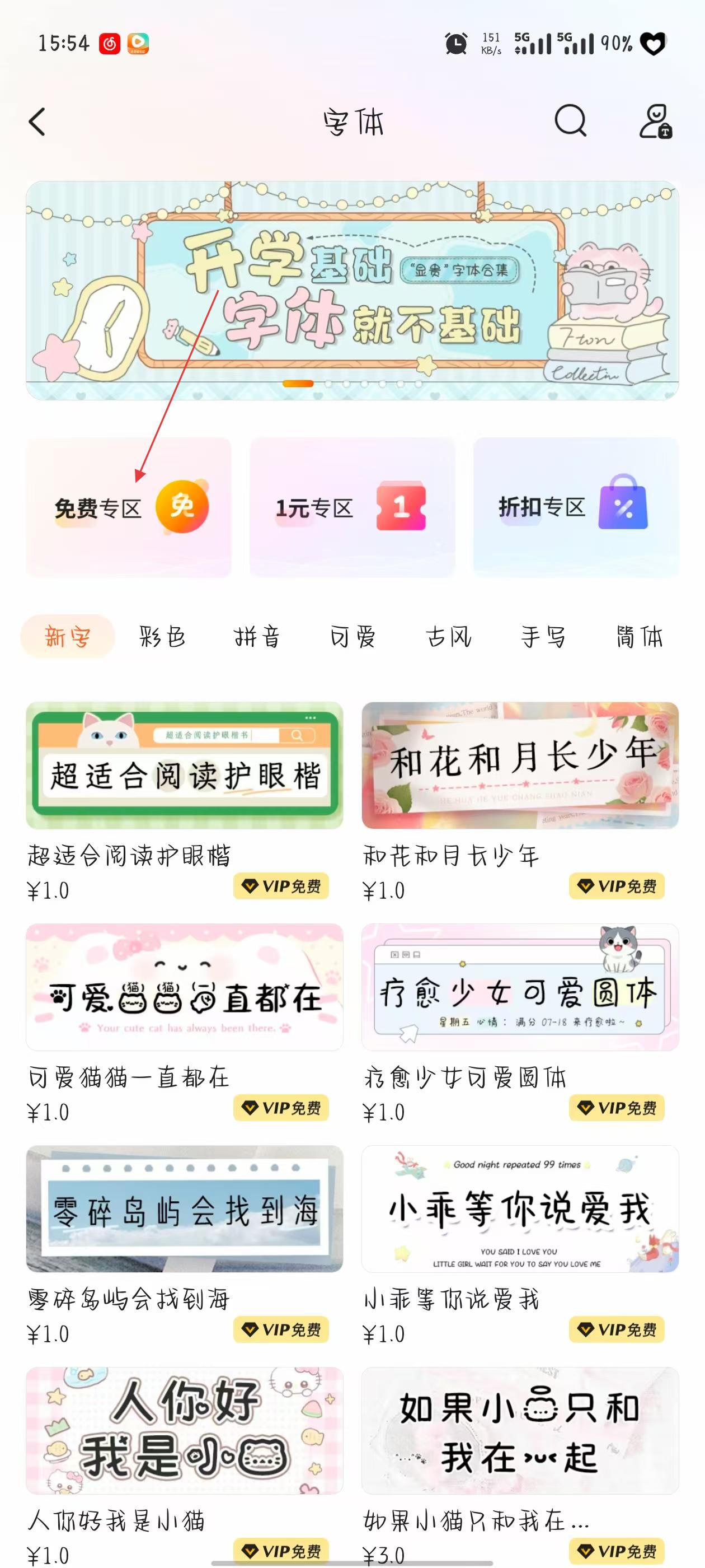 2、在字體頁面中,找到免費專區(qū)并點擊,進入免費字體列表頁面,瀏覽展示的各類免費字體。