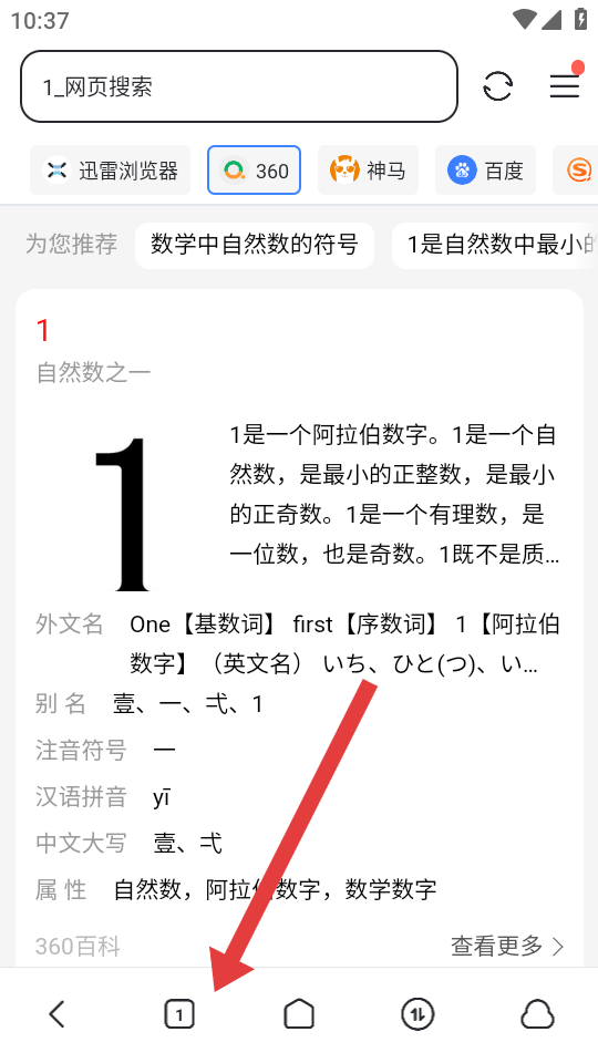 1、打開迅雷APP,點擊底部導航欄中間的標簽頁圖標,顯示窗口1的方形圖標,進入標簽頁管理頁面。