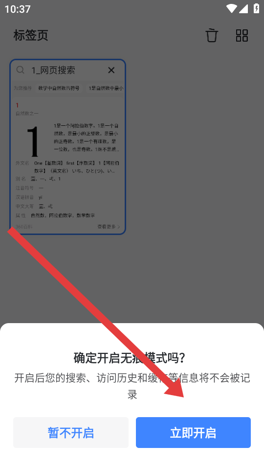 3、在確認框中,點擊立即開啟的按鈕,即可啟用無痕瀏覽模式,開啟后搜索、訪問歷史和緩存等信息不會被記錄。