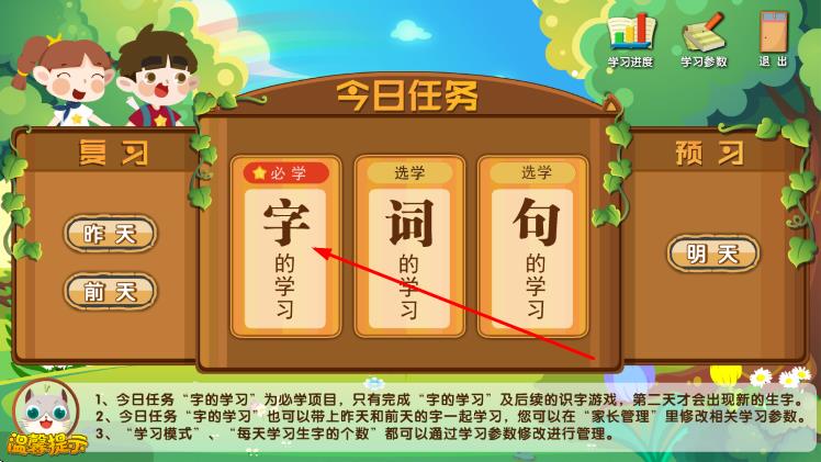 2、點擊今日任務(wù)板塊中的字的學(xué)習(xí)選項。