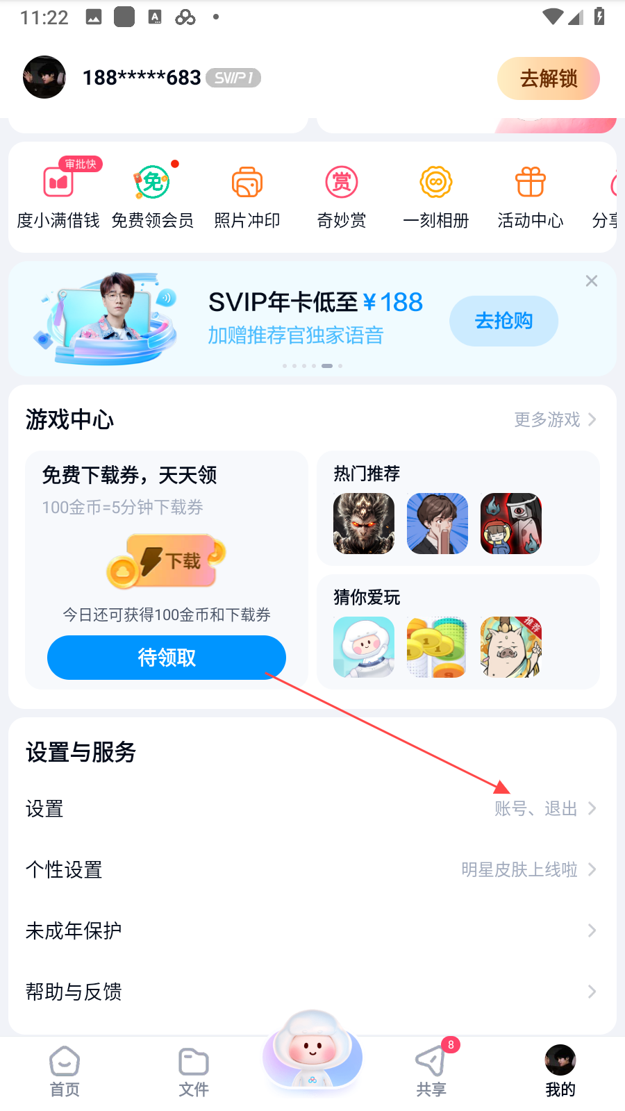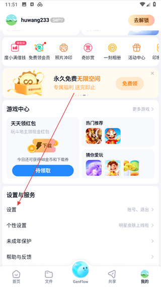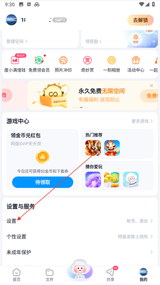 1、打開百度網(wǎng)盤應(yīng)用,點擊底部導(dǎo)航欄中的我的選項,進入個人頁面,在設(shè)置與服務(wù)的板塊中找到設(shè)置,進入設(shè)置界面。