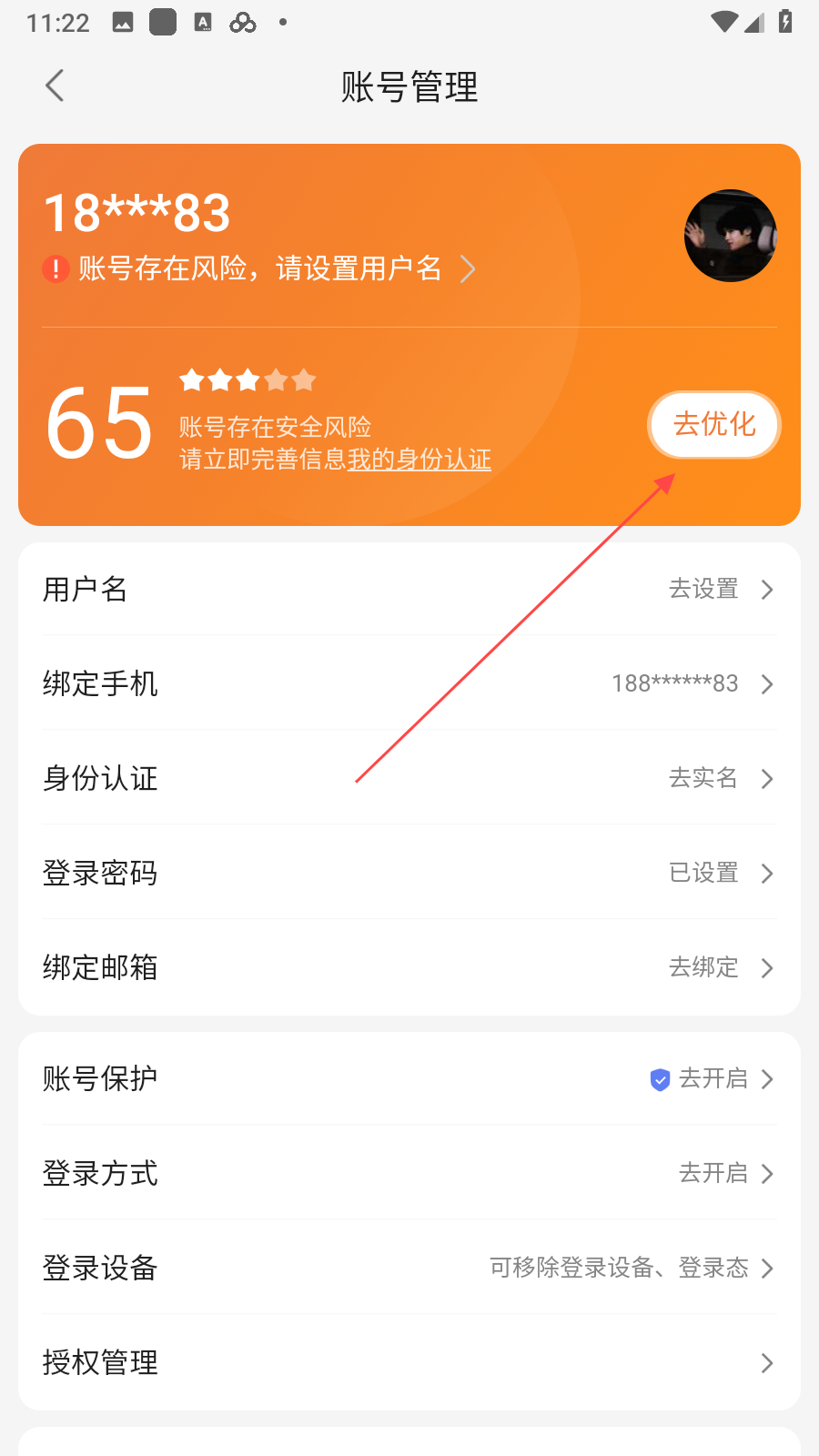 3、若要優(yōu)化賬號安全,點擊賬號卡片上的去優(yōu)化按鈕,按提示完善信息,若要設(shè)置用戶名,點擊用戶名右側(cè)的去設(shè)置,還能對登錄密碼、綁定郵箱等進行設(shè)置和管理。