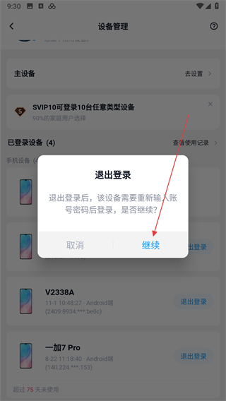 4、點擊設(shè)備的退出登錄,點擊繼續(xù)即可退出。