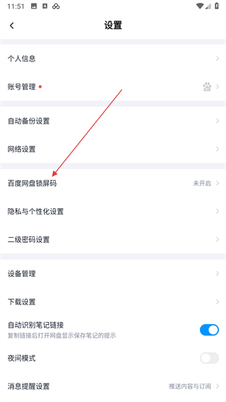 3、在設(shè)置頁面中找到百度網(wǎng)盤鎖屏碼選項,點擊進入鎖屏密碼的設(shè)置頁面。