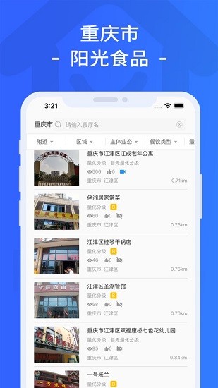 重慶市陽(yáng)光食品是款非常好用的食品安全監(jiān)管app,不僅可以從上面看到周邊好吃的餐飲店面,還能監(jiān)督后廚的衛(wèi)生條件和工作環(huán)境,讓用戶們放心安全的享受食品。重慶市陽(yáng)光食品app服務(wù)消費(fèi)者、餐飲單位、監(jiān)管部門(mén)三大用戶群體。實(shí)現(xiàn)餐飲單位自我監(jiān)督、監(jiān)管部門(mén)的有效引導(dǎo)精準(zhǔn)監(jiān)管、社會(huì)公眾參與共同治理體系。