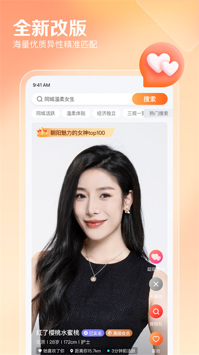 幫助中國(guó)1.8億單身用戶告別單身的婚戀相親交友應(yīng)用,同城交友,相親約會(huì),百合網(wǎng)交友a(bǔ)pp為大家提供快速約會(huì),安全見面的交友平臺(tái)!看美女or帥哥真實(shí)生活照,省去聊天步驟,直接進(jìn)入約會(huì)見面的情感天地。
