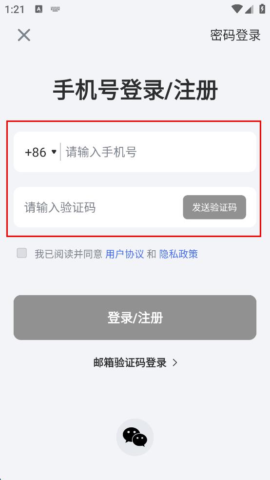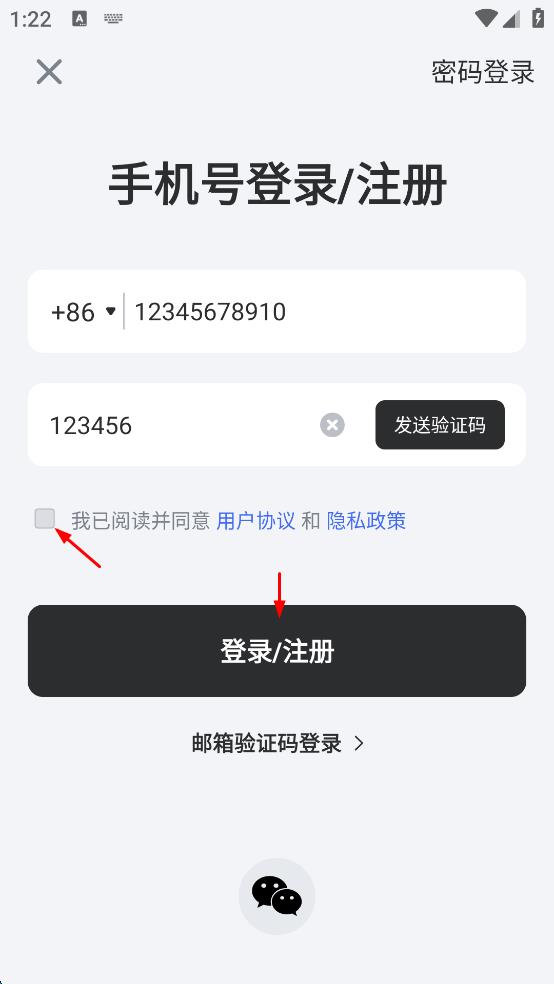 4、勾選“我已閱讀并同意用戶協(xié)議和隱私政策”,點(diǎn)擊“登錄/注冊(cè)”按鈕。