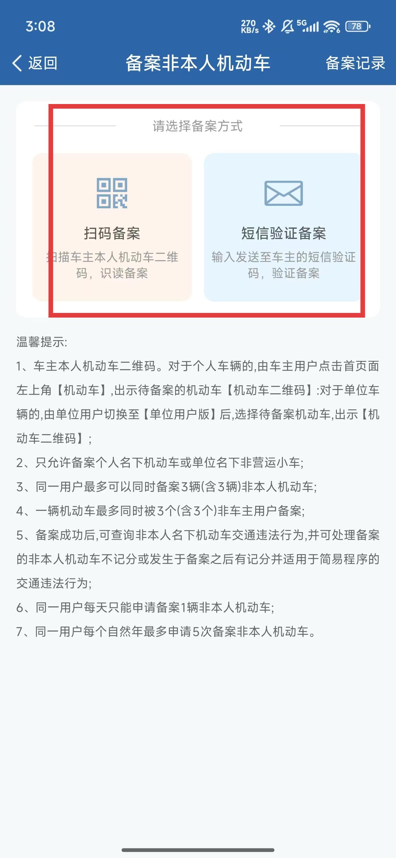4、在跳轉(zhuǎn)到備案非本人機動車頁面后,可以任意選擇下方兩種方法進行備案。