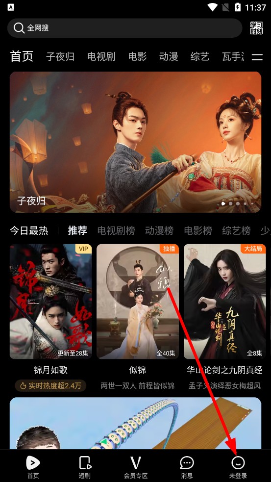 1、打開騰訊視頻2013手機(jī)版,點(diǎn)擊首頁底部導(dǎo)航欄最右側(cè)的「未登錄」圖標(biāo),進(jìn)入個(gè)人中心頁面。