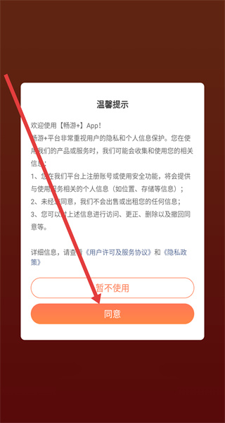 1、在打開暢游App后,可以通過點擊彈窗中的同意按鈕,進入使用。