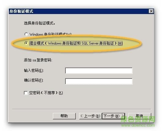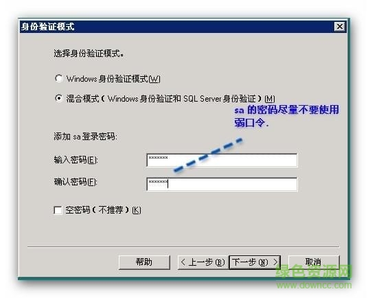 選擇"混合模式",并輸入sa(管理員)密碼,如下圖: