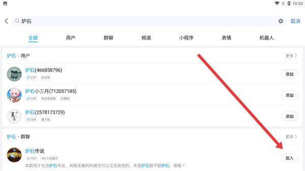 3、在搜索完詞條后,在下面找到對應(yīng)的群聊點擊加入按鈕,即可進(jìn)入群聊。