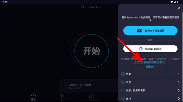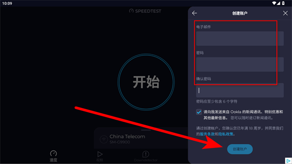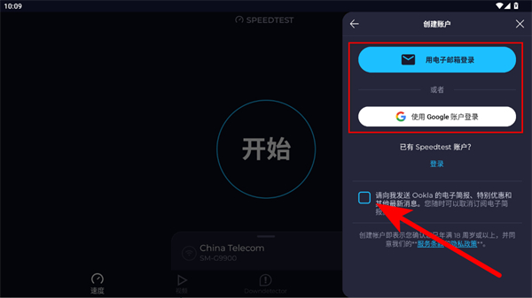 3、選擇注冊方式,如用電子郵箱登錄,并根據(jù)需求勾選是否接收Ookla的電子簡報等信息。
