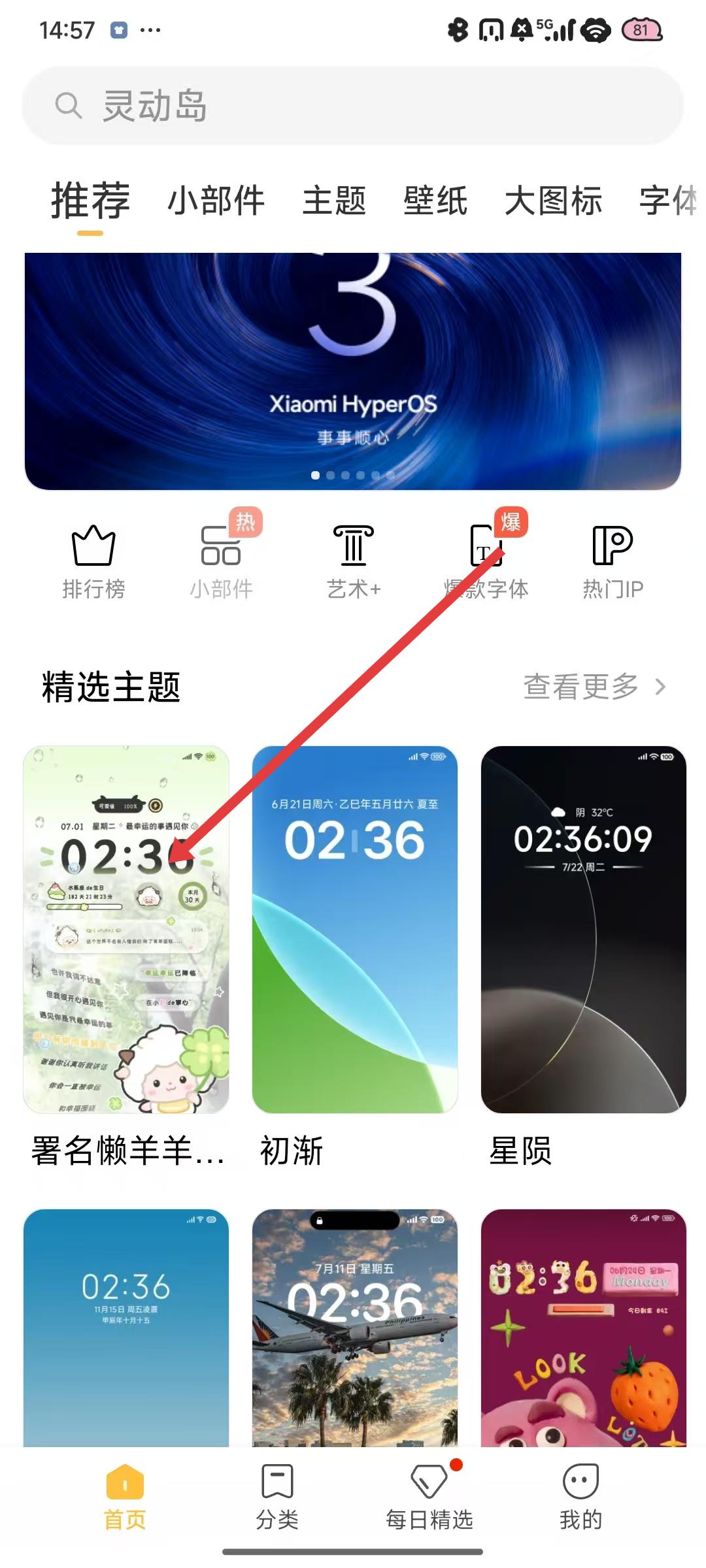 1、打開小米手機(jī)的主題壁紙應(yīng)用,在推薦頁(yè)面的精選主題板塊,瀏覽并找到如署名懶羊羊...等自己喜歡的主題。